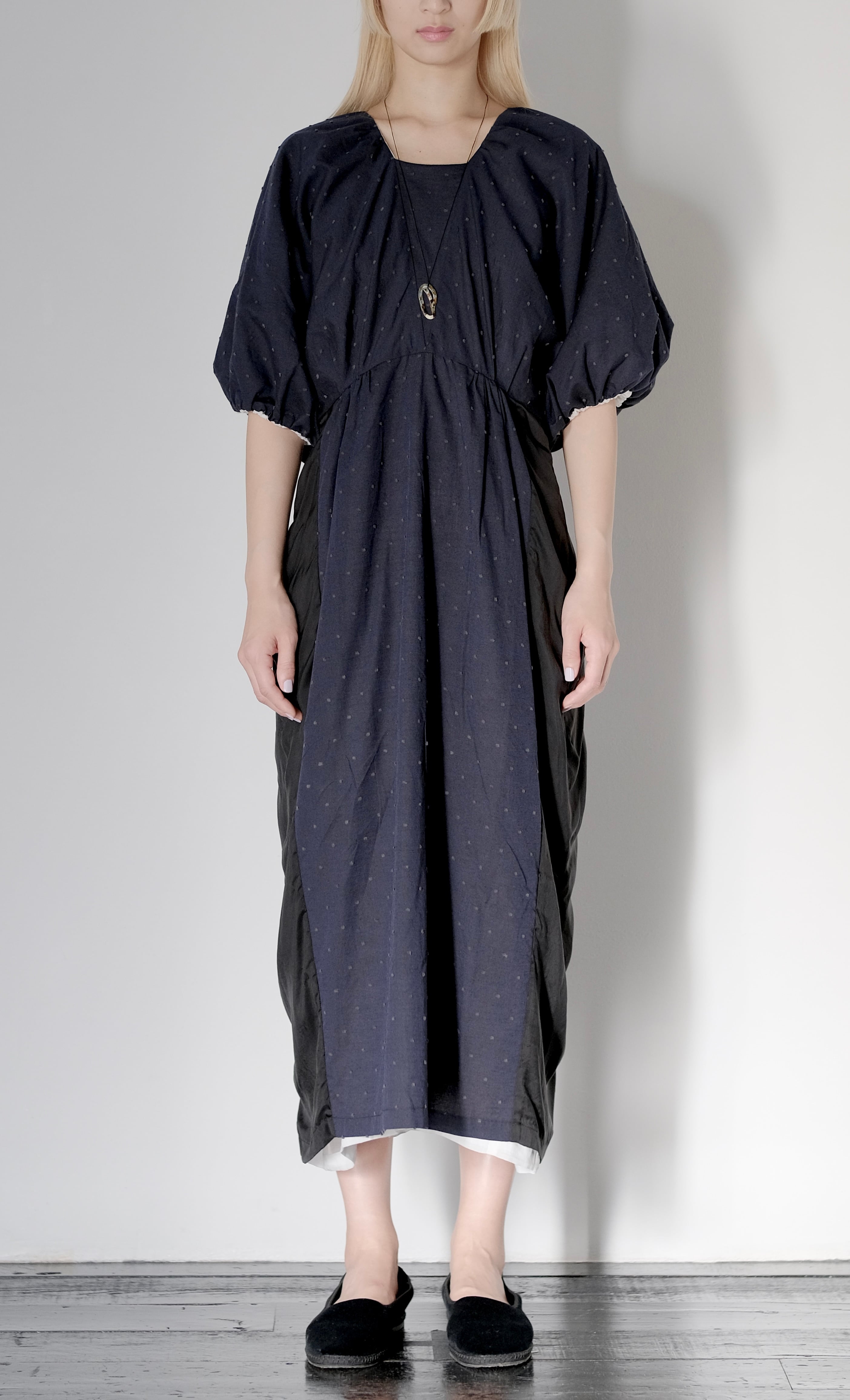 シアーなラミー素材とコットンリネンのドット柄がリバーシブルになったドレス。