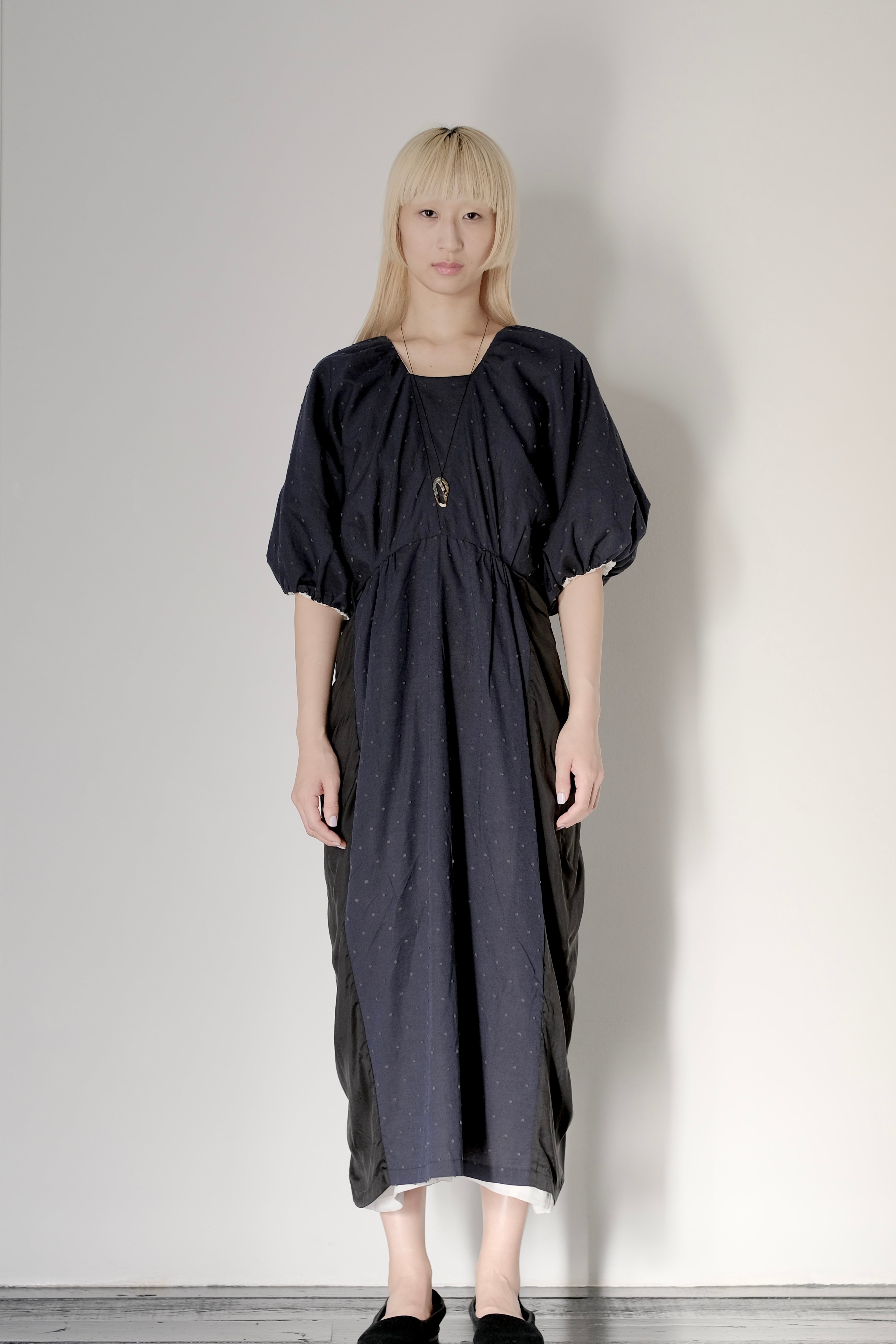 dress.83 dual face puff dress dot navy x sheer white