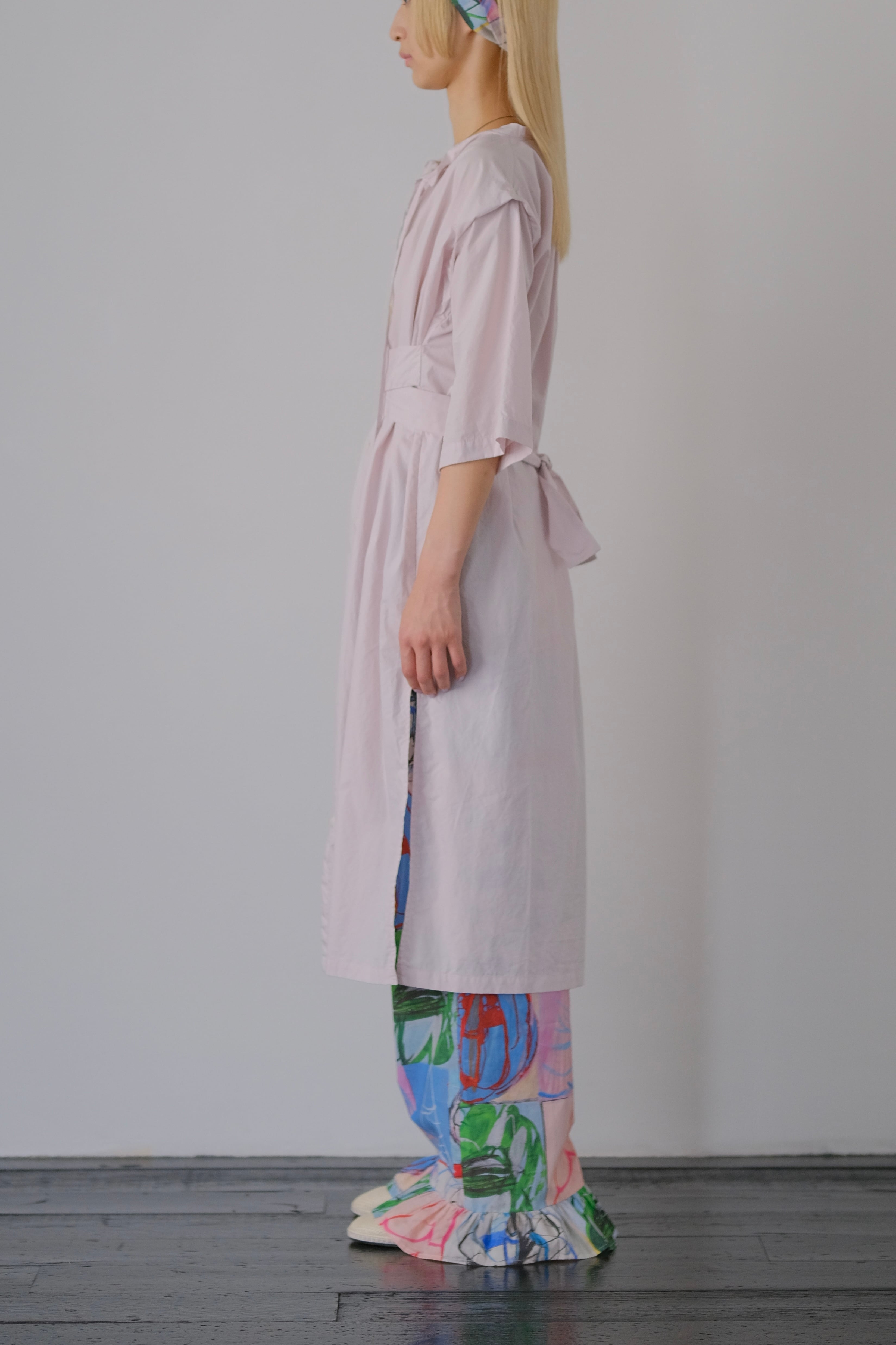 ボタンの面を前にして羽織にもなり、脇の深いスリットはボトムを重ねても重くならないデザイン。