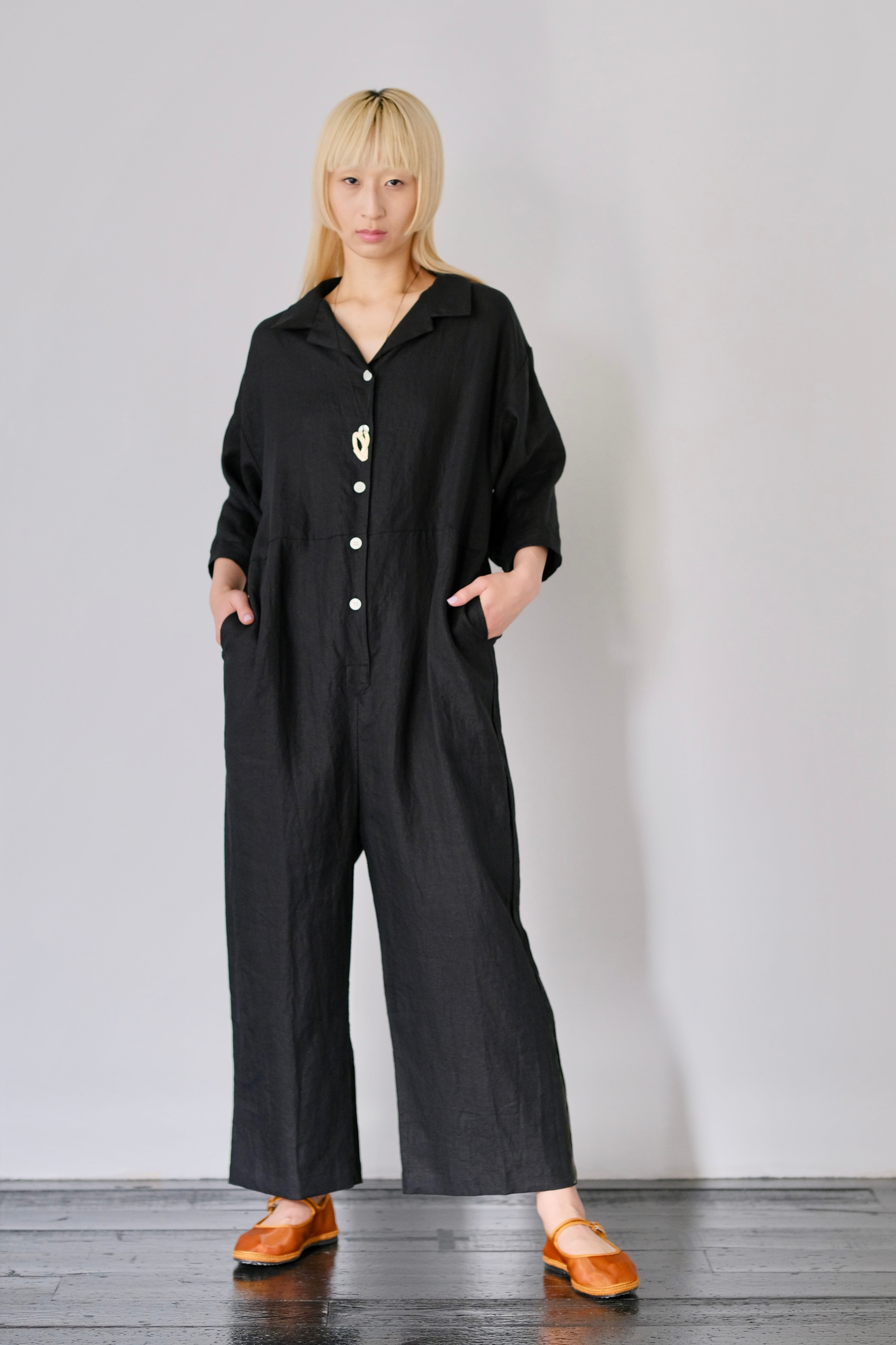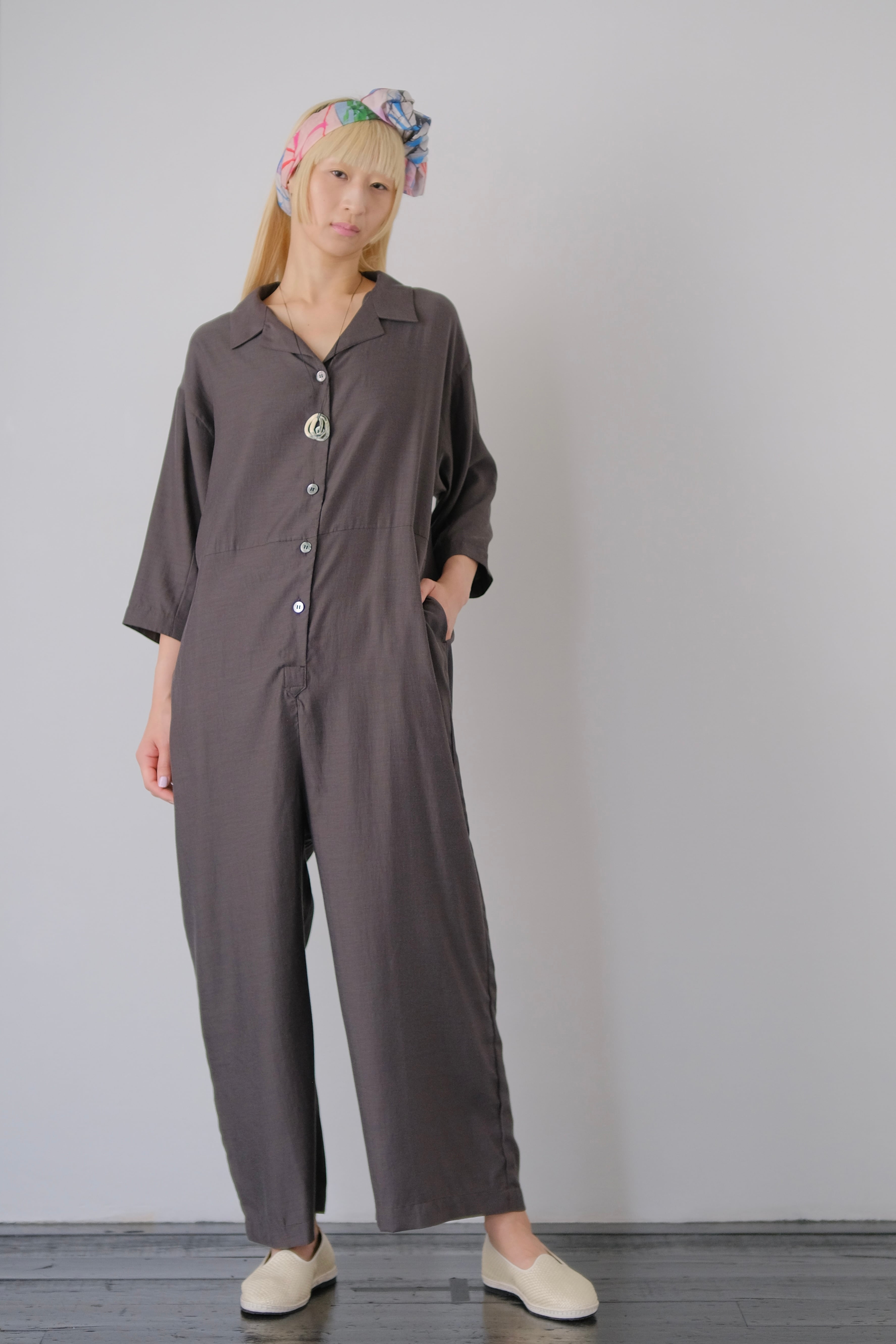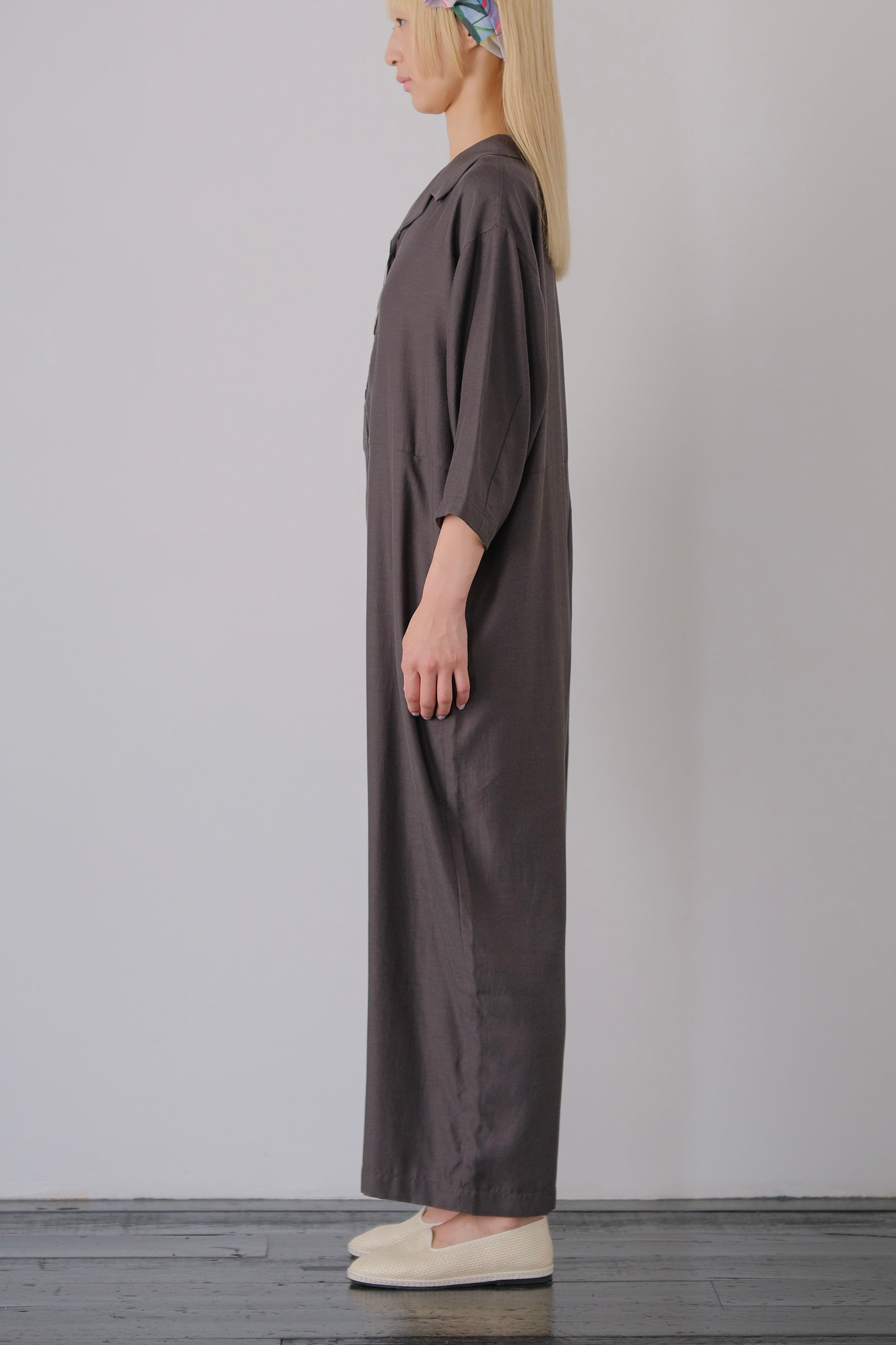 開襟シャツとワイドめなパンツが繋がったツナギドレス。